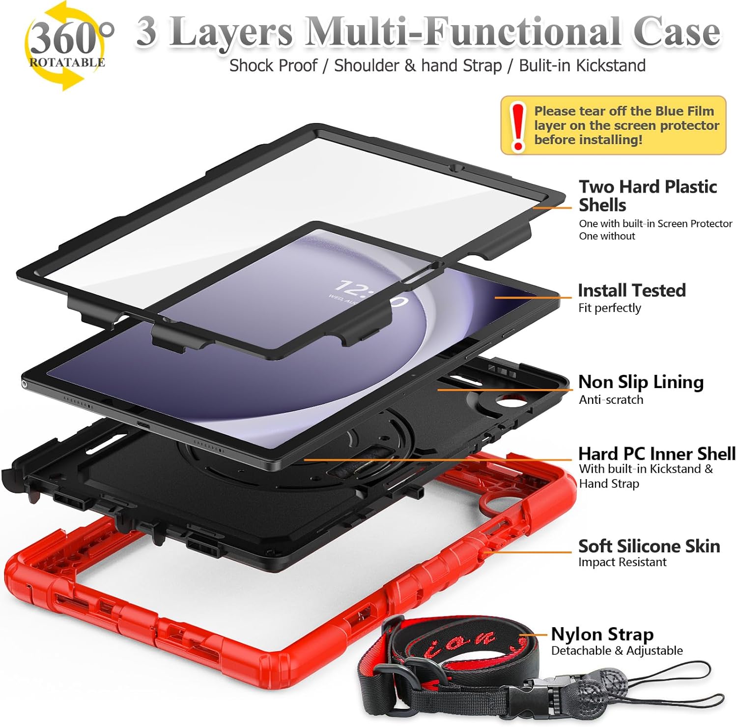SEYMAC stock Case for Samsung Galaxy Tab A9+ Plus 11”, Full-Body Drop Protection Case with Screen Protector Pencil Holder [360° Rotating Hand Strap] &Stand, Red+Black