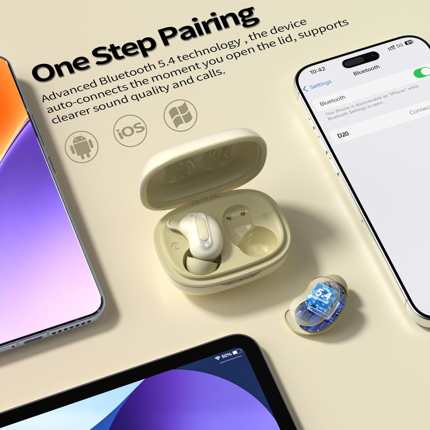 D20 Sleep Earbuds – Made for Side Sleepers and Better Sleep. The D20 wireless earbuds offer ultra-light comfort, stable fit, and a pressure-free design for all-night wear. With exclusive sleep mode, there’s no beeping or low battery alerts—just uninterrupted rest. Powered by Bluetooth 5.4, Hi-Fi sound, 4 ENC mics, and hybrid ANC, they deliver clear calls and immersive audio. Enjoy 8 hours of use plus 40 hours with the case—perfect for sleep, travel, and daily listening.