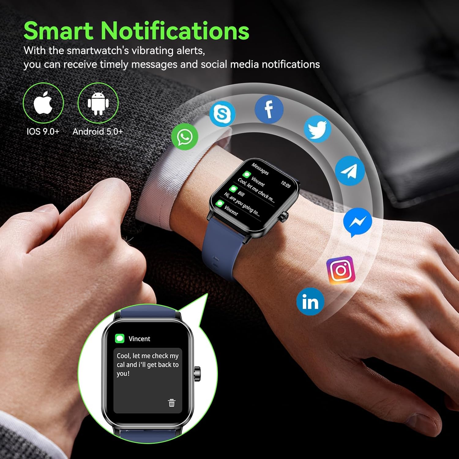 Bluetooth Call & Smart Reminder: Smart watch is equipped with an advanced 5.3 chip, allow you to make Bluetooth calls, sync contact information and store call history. Also can send vibrating alerts for messages and various social media notifications