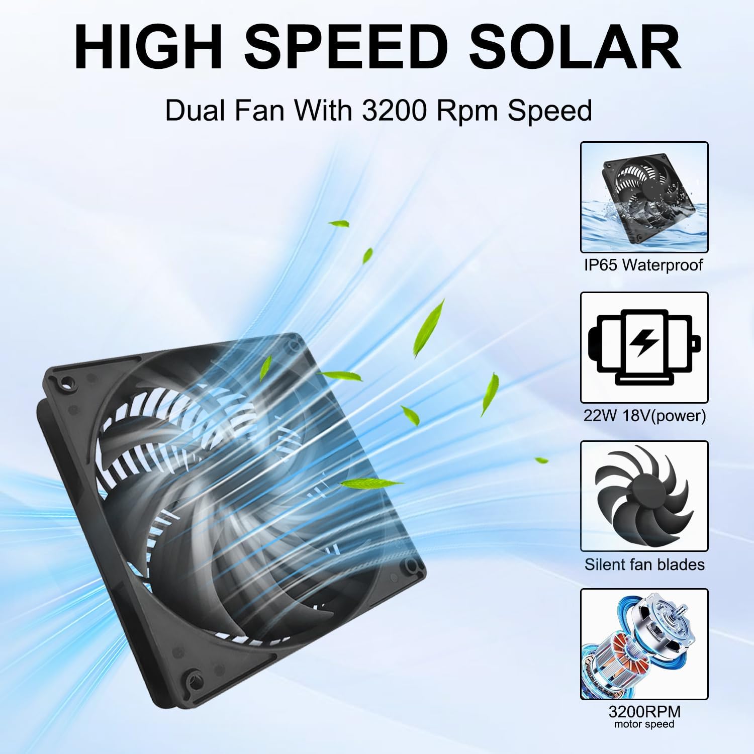 Solar Powered Fan Kit 17.72 Inch IPX7 Weatherproof, 22W Solar Panel with 2 Waterproof Fans, Intake or Exhaust Air Fan for Outside Backyard Chicken Coops, Greenhouses, Doghouse