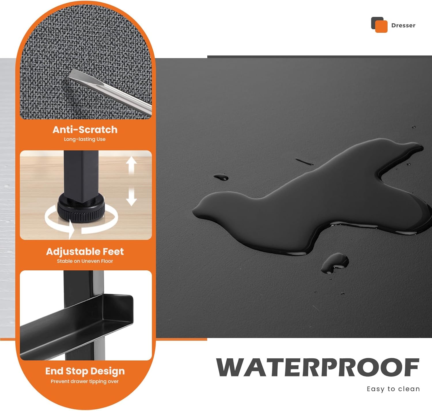 Studry & Durable: The nightstand has a strong steel frame and water-resistant wooden top to ensure a long service time, easy-pull plastic handles to make opening and closing smooth, and 4 adjustable plastic feet to protect the floor from scratches.