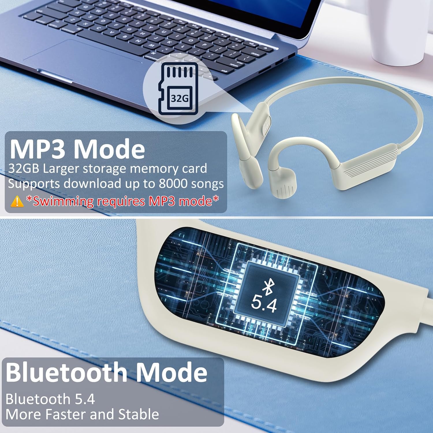 MP3 and Bluetooth Dual Mode: These versatile underwater headphones feature both Bluetooth connectivity and built-in 32GB memory (stores approximately 5,000-8,000 songs), Enjoy your music offline in various scenarios without needing your phone in MP3 mode. Double-click the multi-function button to switch between Bluetooth mode and MP3 mode. ⚠️Note: Make sure the downloaded songs are in supported formats (MP3, WAV, WMA, FLAC)