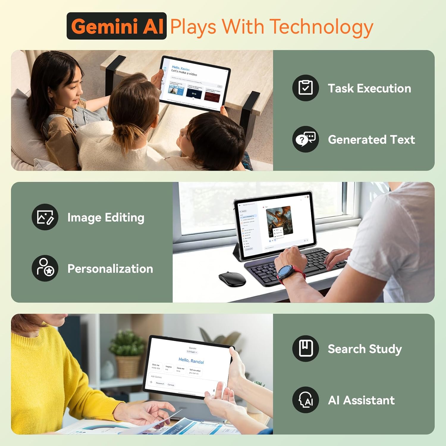 ”Next-Level Android 15 Tablet Supercharged with Gemini AI” Experience true intelligence with Google’s Gemini AI built into this Android 15 tablet. Get real-time language translation for travel or business meetings, smart task prioritization for busy schedules, and predictive text that learns your writing style. Perfect for professionals and students who need cutting-edge tech that keeps up with their demanding lifestyles.