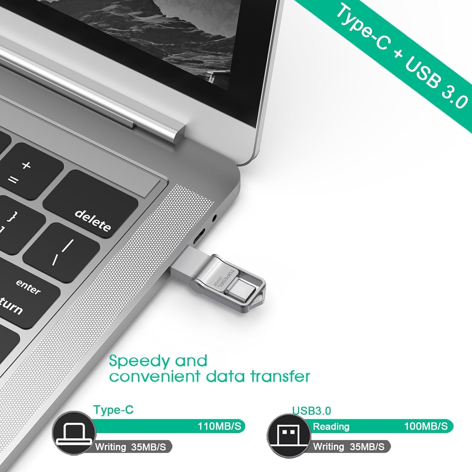 Utilizing USB 3.0 technology to achieve up to 110MB/s read speed and 35MB/s write speed, this USB C flash drive provides ultra-fast performance to transfer your photos, videos, music, and large files.