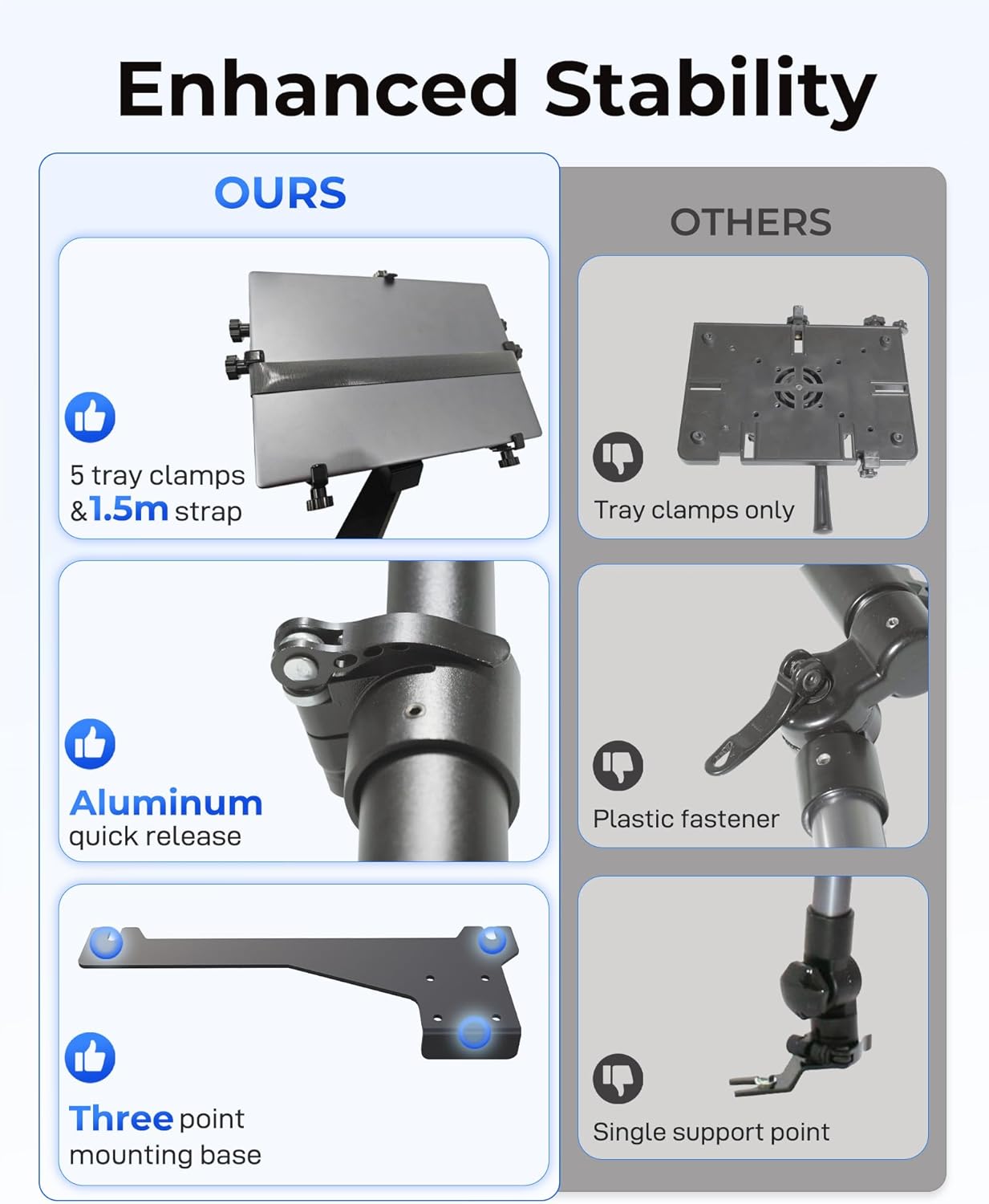 Stable and secure: Three base mounting points of the truck computer holder and riser bases form a triangular stable base, ensuring even force distribution and no shaking. Five adjustable tray clamps keep the laptop firmly in place and prevent slippage