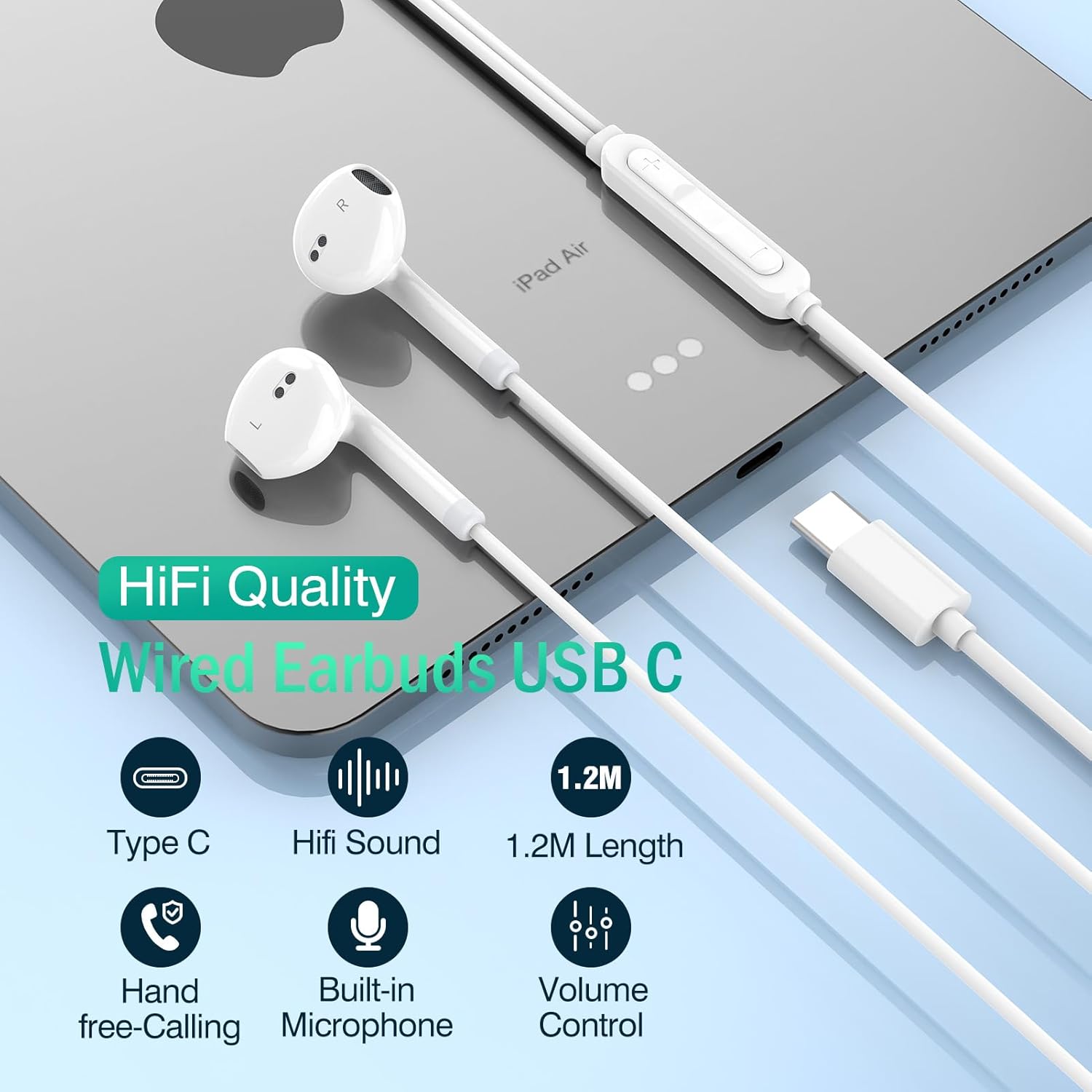 USB C Headphones for iPhone 17 16 15, Wired Headphones USBC for iPad Pro Air Mini, iPad 10th, MacBook, Type C Earbuds for Samsung, Google Pxiel, Earphones for Lenovo, Dell, Microphone, Volume Control
