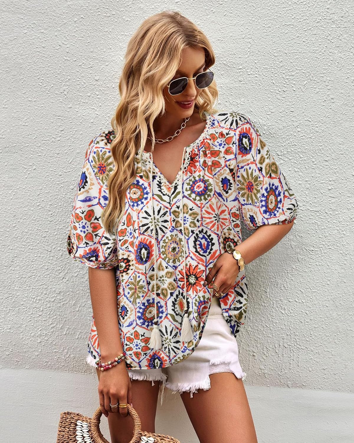 Vivilli Summer Outfits for Women V Neck Short Sleeve Bohemian Shirts Boho Tops