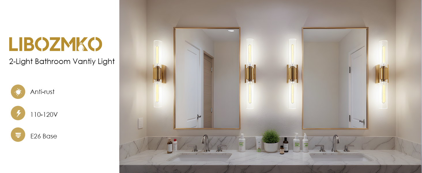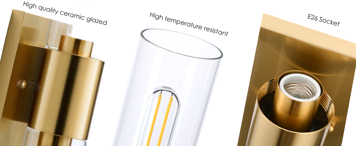 This bathroom sconces features high-grade E26 ceramic sockets with a porcelain-enameled finish for superior heat resistance and extended longevity. The gold wall sconce sturdy metal backplate and thick glass shades ensure reliable performance and a refined aesthetic