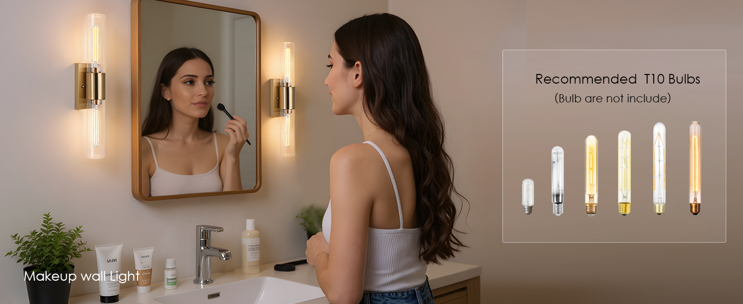 The bathroom light fixtures allowing you to customize brightness with incandescent, LED, or CFL options, uses 2*Max 60W T10 bulbs, fully dimmable when used with dimmable bulbs and compatible dimmer switches (Bulb and dimmer switch excluded)