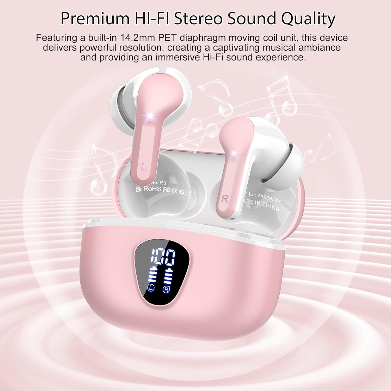Wireless Earbuds, Bluetooth 5.4 Headphones HiFi Stereo, Bluetooth Earbuds with ENC Noise Cancelling Mic, IP7 Waterproof in Ear Earphones, 48H, LED Display Ear buds for Pad Phone Workout Sports, Pink