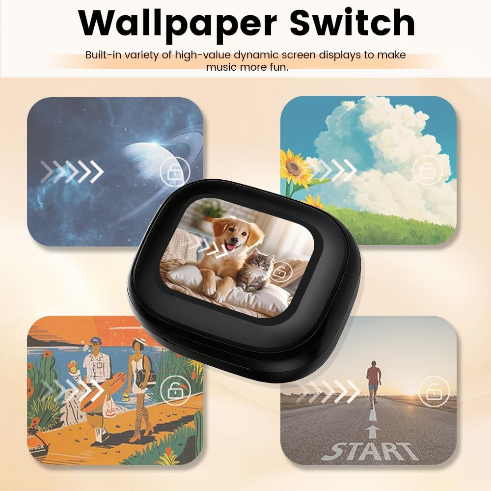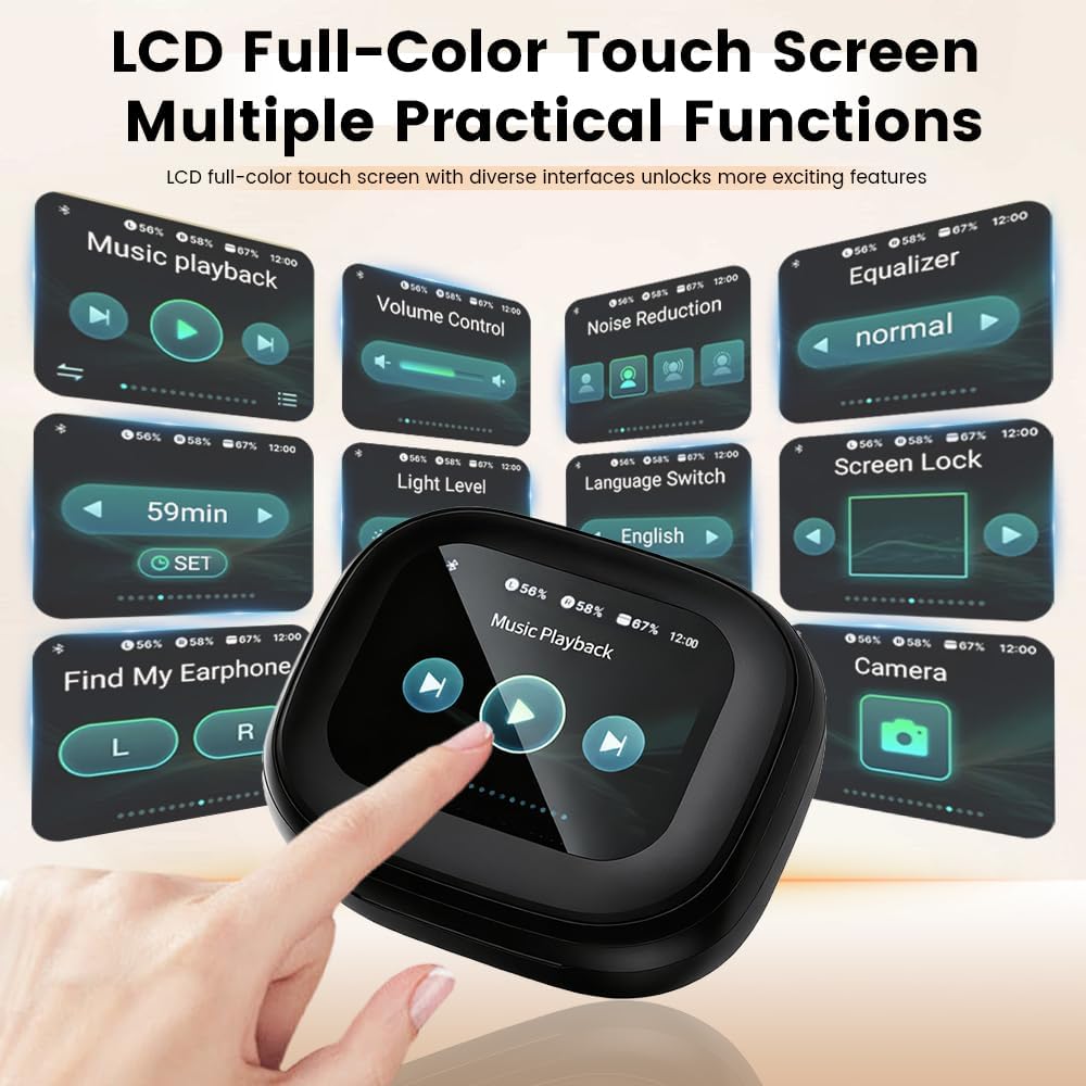 【Intelligent Touch Screen】Our bluetooth earbuds feature not only smart single-tap controls but also an multifunction touchscreen charging case. With fingertip touches, effortlessly switch songs, adjust volume, 5 EQ modes, locate earbuds, or take calls. Whether in work meetings or intense workouts, the Smart Interactive System keeps your music experience effortlessly smooth—delivering true hands-free control.