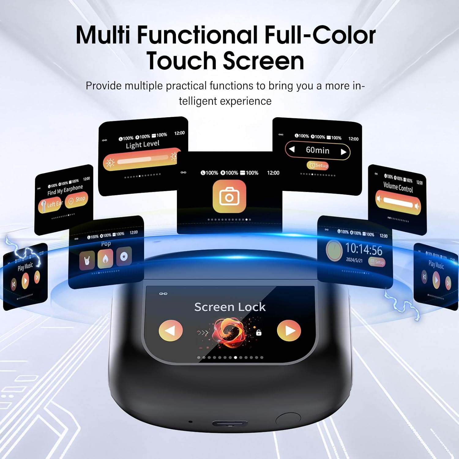 Multifunctional Smart Touch Screen Earbuds: Bluetooth earphones charging case features a unique and intelligent full-color LED touch screen. You can use the ear buds or charging case to control music playback, change tracks, answer and end calls and more. In addition, the touch screen also provides a series of functions such as volume adjustment, camera control, 7 languages switching, wallpaper switching, screen brightness adjustment, headphone search, timer, etc.