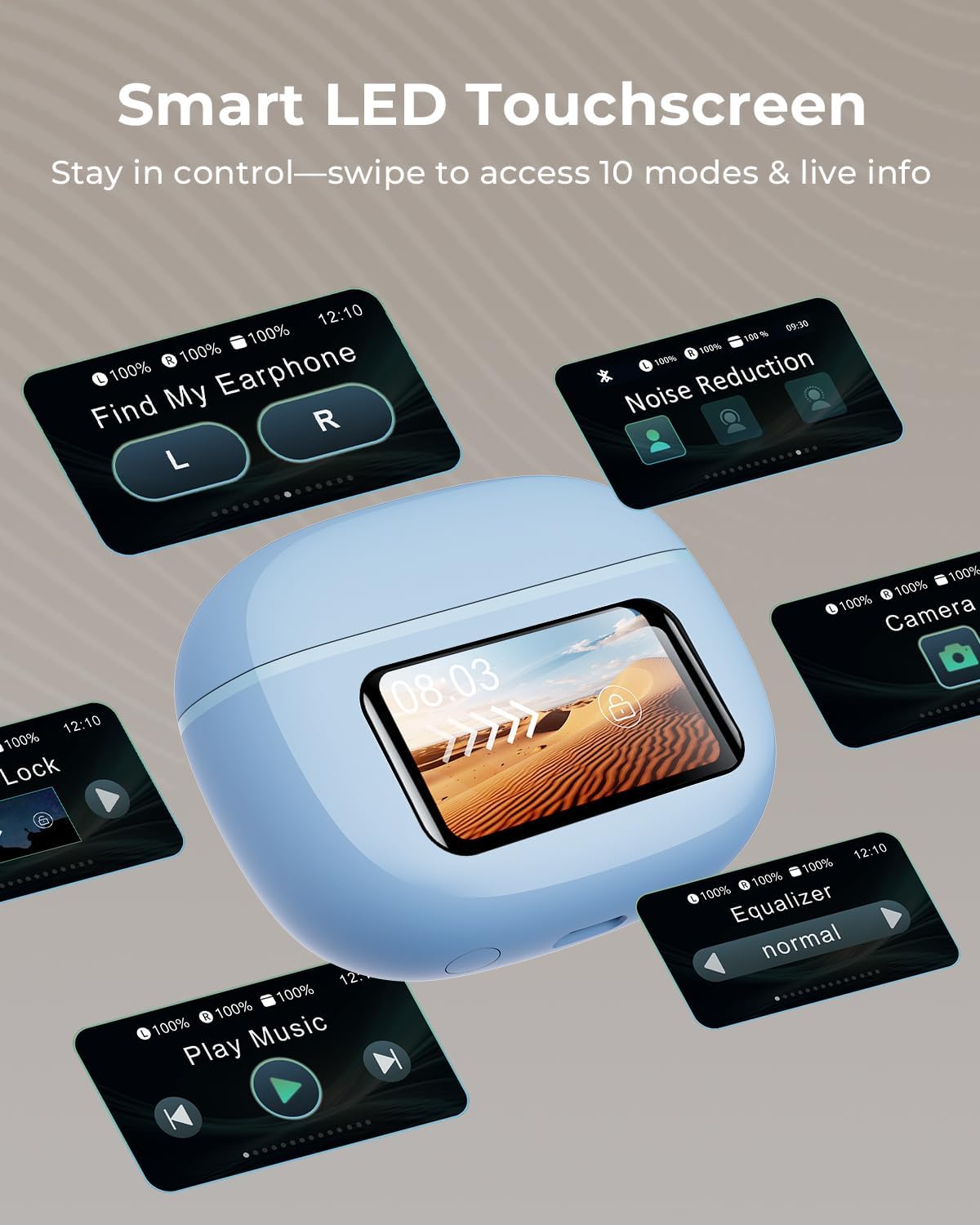 Smart Touchscreen Case for Effortless Control: Our wireless earbuds come with a smart charging case that does more than just charge. Unlike traditional cases, it features a responsive touchscreen—skip tracks, adjust volume, manage calls, take remote photos, or locate your earbuds with just a tap or swipe. Packed with 10 powerful functions in one compact case, it’s the ultimate control hub. No phone needed, making everything more convenient and smarter.