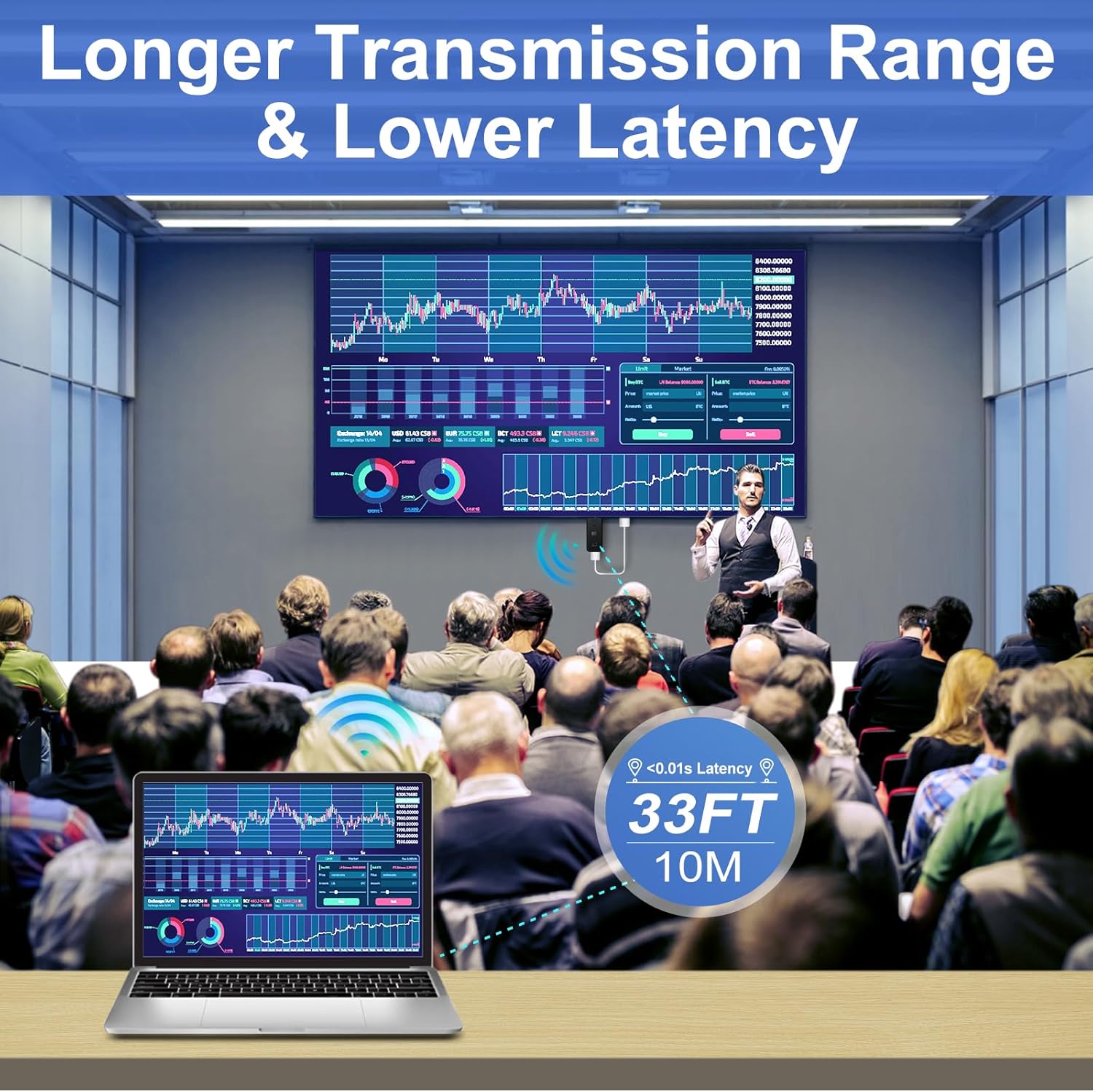 Dual Band 2.4G/5G Wireless Transmission: Equipped with 2.4G/5G dual-band technology, this HDMI wireless receiver ensures stable and fast data transmission, with a range of up to 33ft (10m). The signal can easily pass through walls and obstacles, providing you with uninterrupted streaming and low-latency (<0.01s) performance