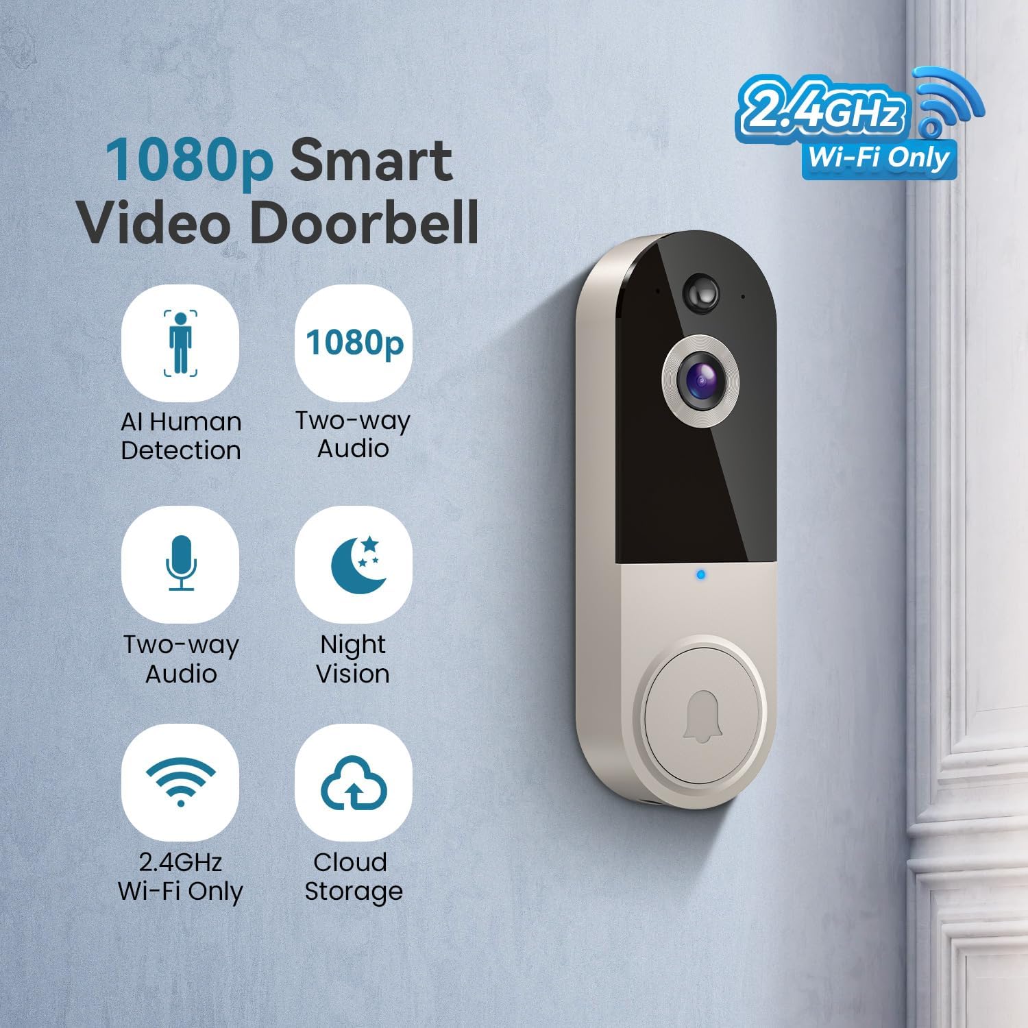 Wireless Wi-Fi Video Doorbell Camera with Night Vision, Two Way Audio, AI Motion Detection and Cloud Storage(Sold Separately),2.4G WiFi Only (Linen)